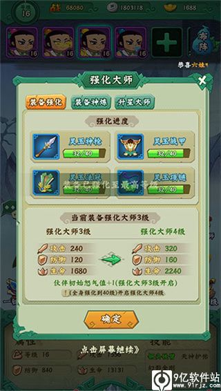 装备可以通过强化来提升装备的属性,强化需要消耗银币,强化的最高等级为游戏角色当前等级的2倍,比如你是20级,最高就能把装备强化到40级,除了强化系统以外,强化还有一个强化大师功能,全身装备每10级可以提升1级强化大师等级,强化大师等级会额外提升属性比如全部装备达到50级,强化大师的等级也就是5级,强化大师可以提升攻击,防御和生命属性,建议对于强化等级进行平均性的提升,这样的收益更大。