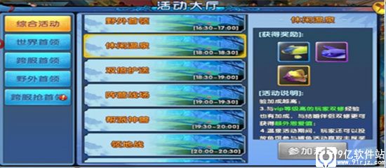 除了剑阵跟主线/支线任务外,还有一些活动能提供大量经验哦。在每天的12:00-12:30以及18:00-18:30两个时间段会开放休闲温泉活动,活动期间,玩家每隔5秒会获得丰厚的经验奖励,VIP等级越高经验加成越高哦。