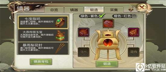 锻造配方,每件镇派之宝都分为【绿色-紫色】和【橙色-红色】两种配方,请各位少侠根据自己拥有的素材数量来选择适合的配方吧。橙色品质以上的配件在未装备时,是可以在寄售行进行交易的。配件的锻造属性是随机的,尝试获得最适合自己属性的配件。配件类型,每个镇器都由2-6个不同的配件组成,每次锻造所能获得的配件部件是随机的。还可以通过特殊锻造来就行额外的强化,打造自己心仪的配件。