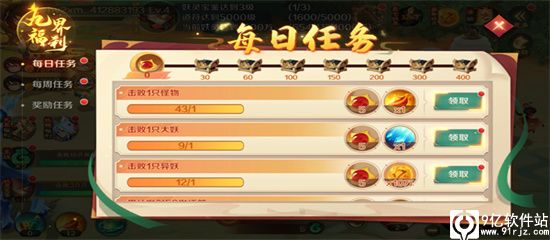 6、点击进入九界福利完成任务,即可领取奖励(经验值、妖灵、元神、狂暴、凝神、神灯、冰咒等)