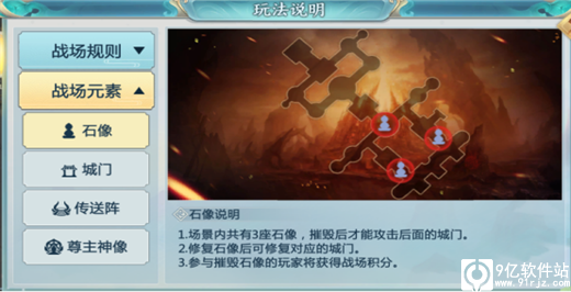 战场内有多个不同的战场元素,分别是石像、城门、传送阵、尊主神像等。