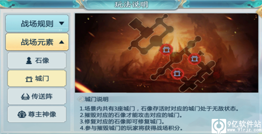 2、城门:战场地图内共3座城门,分布在3座石像的后面,石像存在时城门处于无敌状态,摧毁石像后才能攻击城门