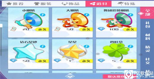 该分类为游戏中各种道具,又包括礼包、材料、精灵道具、社交、其他五个子分类。在这里可以购买到各色礼包、材料以及最为热门的大小喇叭等道具。