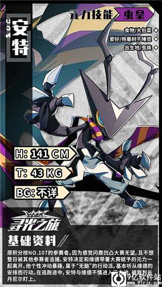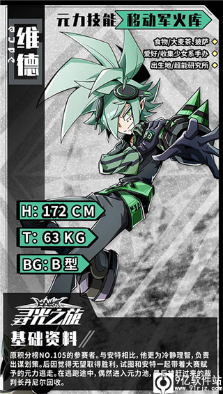 1、大赛资料库·参赛者:维德维德,原积分榜NO.105的参赛者。与安特相比,他更为冷静理智,负责出谋划策。后因觉得无望取得胜利,试图和安特一起在寻光之旅中带着大赛赋予的元力逃走。在逃跑途中,偶然进入元力池,最后被赶过来的裁判长丹尼尔回收。