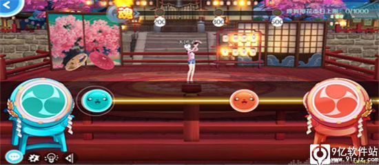 操作方式:点击屏幕两侧蓝色与红色大鼓,以起到跟随节拍舞动的效果,蓝色note:点击屏幕左边的鼓。红色note:点击屏幕右边的鼓,黄色的长条形note:连续点击屏幕左、右两边的鼓跳舞可获得:魂值;魂值达到一定的数量,可获得奖励樱花币跳舞获得的樱花币,有每日上限。