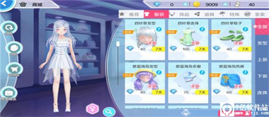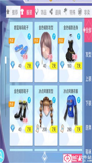 服装分为发型、上装、下装、鞋袜4个部位,此外还有上下装一体的连体服饰。连体服装无法与上下装同时装备