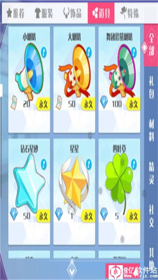 该分类为游戏中各种道具,又包括礼包、材料、精灵道具、社交、其他五个子分类。在这里可以购买到各色礼包、材料以及最为热门的大小喇叭等道具。