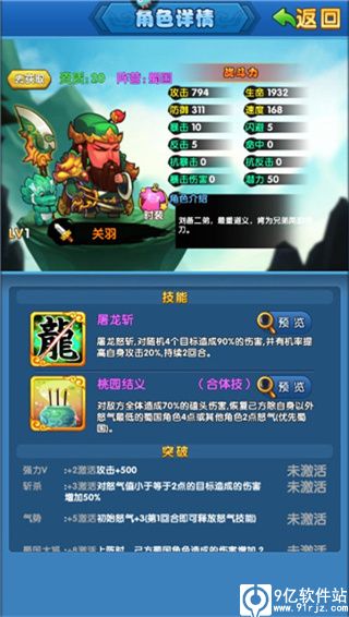 4、关羽——肉盾型武将,阵营所属:蜀国,成长资质:20,技能:青龙偃月斩。