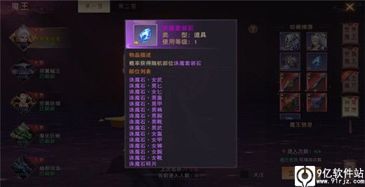 神魔禁地:神魔禁地掉落为个人归属,击杀该地图下魔王和精英怪物均会增加怒气,怒气满100将会被逐出副本,场景内每1分钟自动增加1点怒气,死亡会增加20怒气。神魔禁地魔王主要产出套装石,而精英怪物则产出套装石碎片,可通过合成,获得套装石。
