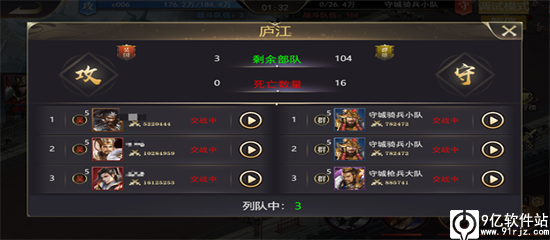 4、攻城战是攻防两边排队对抗的,在战斗界面里面打开右侧的战况界面是可以看到对战的部队列表的,每次打赢的部队就会跑到队列的后面,打输的部队被送回老家。算好排队的顺序有时候还能躲过很多险情。