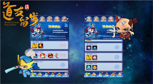 道友里的每日签到正的是我见过最土豪的,送元宝,送神仙,送礼包游戏里有的它都送!!还有只要你充值6元以上你就可以领取豪华礼包,豪华礼包里的宝贝正是让人闻风丧胆元神、突破丹、精练石每天换着法子给你送。