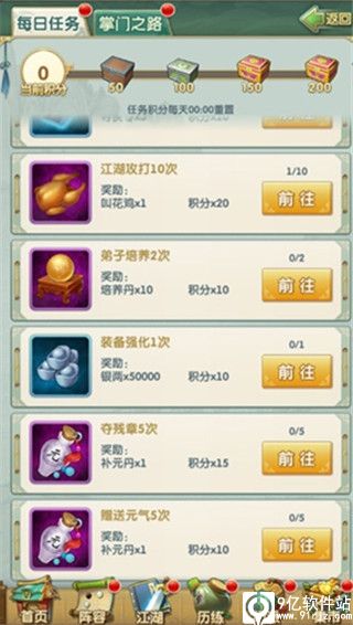 4、当卡在一关时,一定要对装备(血战可获得),武功(夺残章可获得),弟子进行相应的提升