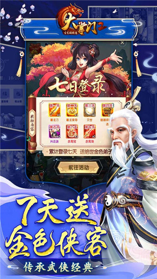 大掌门2官方版是一款以角色扮演为主的策略游戏。在游戏中,玩家将扮演一名门派掌门,在振兴自家门派的同时,收获各种江湖奇遇,结识各路武侠并与其一同对抗强敌,将小说中的著名侠士收入门派,体验到一名掌门人的江湖之旅。本作采用漫画风格绘制游戏内的各种界面,用Q版的可爱角色带给玩家一个新的角色形象,同时创新了弟子、养成、论剑等诸多系统玩法,给游玩的玩家一个最真实的江湖。