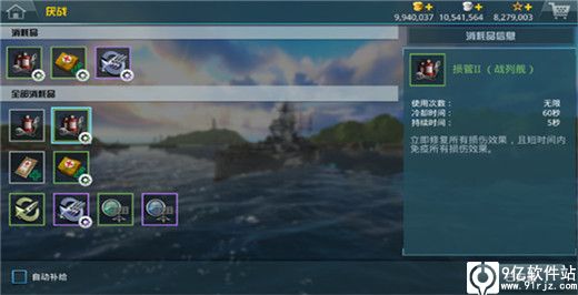 4、消耗品方面,损管对战列舰来说真是非常重要,能让我们在和敌人进行火拼的时候生存力有一定的保障,其他的消耗品带上维修,小编还选择了自动输弹 。