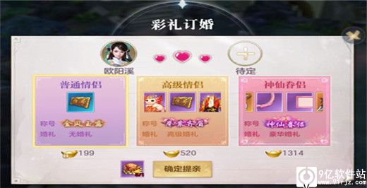 成为仙侣,与异性好友亲密度达到520后,即可进行结婚,完成结婚流程一共有3个步骤。首先,一方要提出彩礼订亲,系统有3个不同档次的彩礼可以选择,赠送彩礼后仙侣双方都可获得奖励。