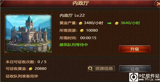 1、内政厅的等级决定了其他建筑的上限,所以领主们在升级后的第一件事应该就是升级该建筑。在内政厅中,领主可以定时征收黄金,一天可以征收5次,数量相当可观。