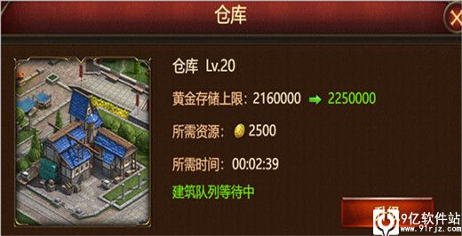 4、在仓库中,升级等级可以提高黄金储量上限。游戏中随着等级的提高,黄金的产量也会越来越多。尽早提升仓库等级可以避免资源的浪费。