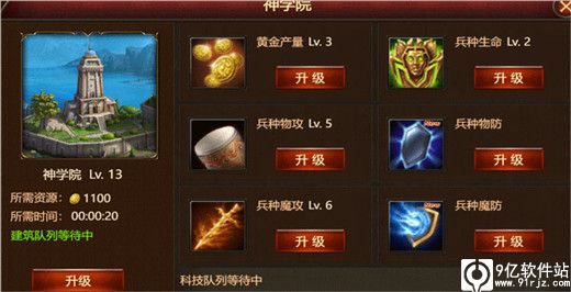 5、在到达21级后,领主们就可以解锁神学院了。在神学院中可以升级大量的科技,例如黄金产量,领主攻防,士兵攻防等。同样随着建筑等级的提高,这些科技的上限也会提高。