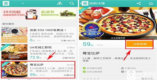 5、打开团购软件,进入首页,选择点击一个团购,然后在进入团购详情界面后,按“立即抢购”按键;
