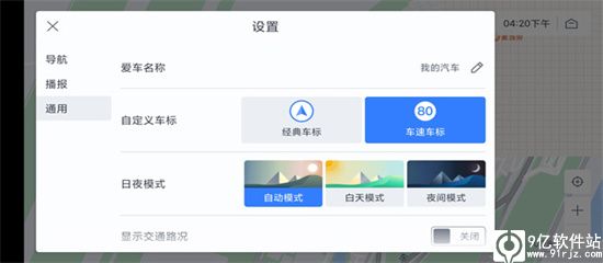 6、在通用设置中,可以设置你的爱车名字、自定义车标以及日夜模式的设置,还能开启显示交通状况、显示比例尺缩放、同步手机端搜索记录等功能