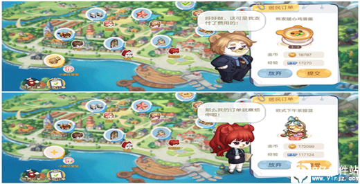右上角书本按钮点开以后,第二个热气球一样的按钮就是订单。在这里可以看到其他玩家/居民的订单,完成订单以后可以获得一定金币和经验值(p.s.在【目标PART8】修复订单气球任务后开启)。另外,大概完成3-6次普通订单会刷新出惊喜订单,有机会获得大量经验、金币,还有晶钻。