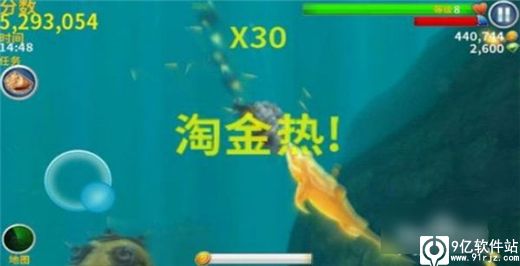 通过游戏中吃人,和各种海洋动物,随机产生的道具,都可以触发鲨鱼的淘金热状态,在淘金热的几秒状态下,鲨鱼吃所有东西都会为它赚取大量金币。