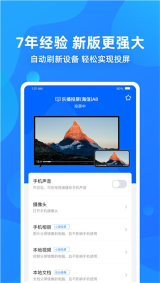 5、本地相册投屏:利用屏幕镜像或手机乐播的多屏互动连接电视,可将手机本地照片,本地自拍视频、、图片、文件投屏到电视或投影仪大屏。