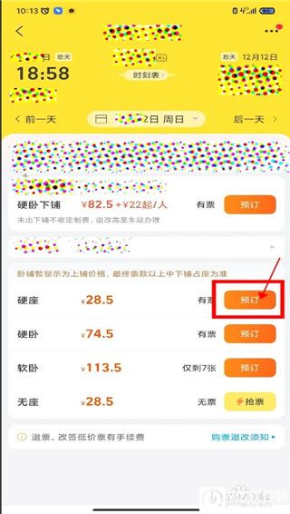 4、在该车次详情界面中,选择座位类型,点击【预定】。