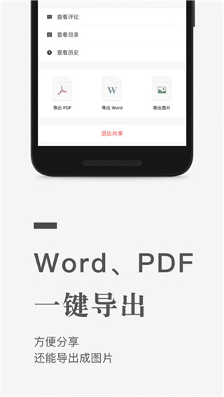 除了直接分享文档,还支持一键生成精美长图、复制链接、导出 PDF 和 Word,并自由分享到微信、、微博、QQ 等多个平台。