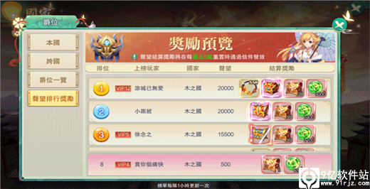 玩家获得爵位头衔之后,每天可以领取对应的俸禄奖励,并在国家分组重置时,根据自己所获得的声望的排名,获得丰厚的结算奖励。