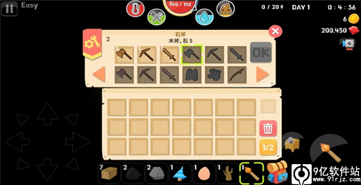 最主要的是先把武器做出来,点击左右按钮可以切换到武器制作栏,可以用五个木头来制作木剑,这样夜晚遇到邪恶生物也有自保能力,当然还可以制作木斧、木镐,这些都是前期必备的物资,有了这些,挖矿或者砍树都能更快。