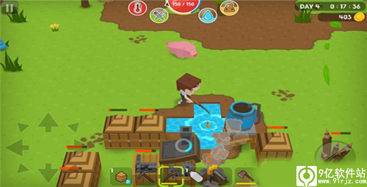 选一个靠近水塘的地方,放置营火与工作台,工作台放好后,在“攻击”按钮上面就会出现工作台图标,点击即可打开工作台。