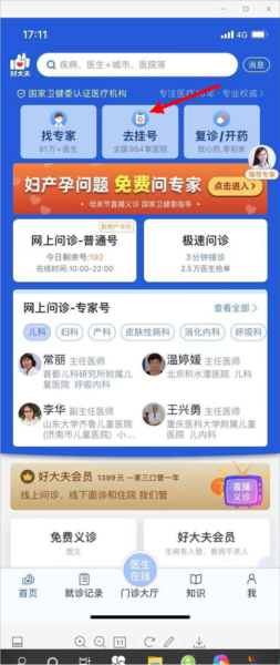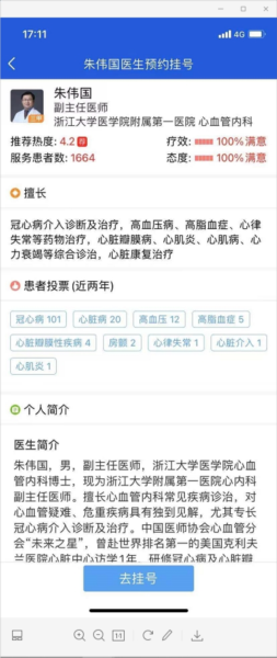 3.找到医生后点击打开,进入到医生详情页面后点击底部的“去挂号”