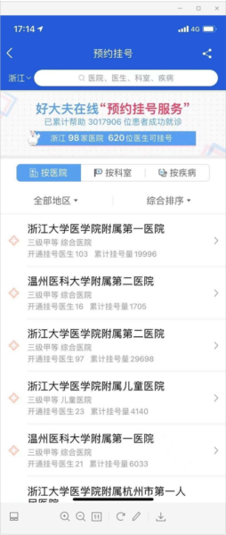 2.用户可以点选地区、医院和科室来限定搜索范围(位置见下图),方便查找医生