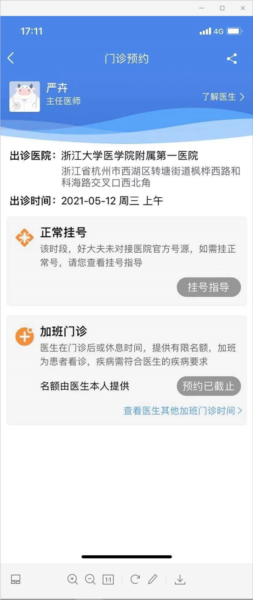 4.进入该医生的挂号页面后,了解挂号说明,依照自己的情况,选择是挂号指导还是加班门诊。“选择就诊时间”弹窗后点击“预约”