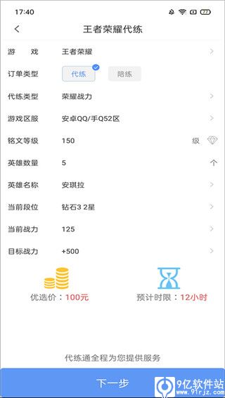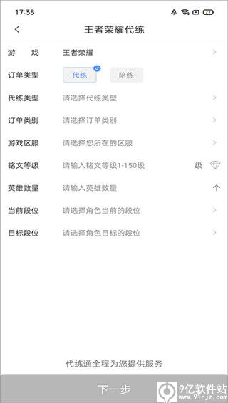 2、选择你要代练的游戏,这里以王者荣耀为例,输入代练类型、游戏区服、当前段位等。