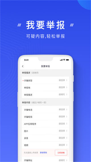 4、通过这个软件可以快速的举报诈骗内容帮助他人提前防范,还是可以一键开启录屏录音,上传诈骗线索