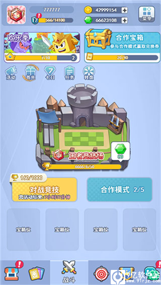 手游中的战斗位于第三栏,这也是游戏中的主界面,从上至下,依次是玩家ID/头像、钻石/金币数量、菜单、黄金令牌、合作宝箱、活动/任务栏、王者竞技场、对战竞技、合作模式、宝箱位,其中菜单栏中包括签到、公告、排行榜、战斗记录、设置、我的反馈、宝典、信箱和兑换码等选项,宝典功能可以帮助玩家更好的查看游戏中的模式、怪物、布洛克和其他信息。
