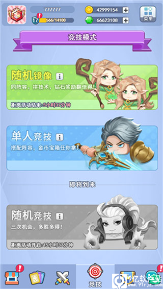 手游中的竞技位于第四栏,区别于对战竞技和合作模式,这个版块中主要是游戏中一些比较新奇的玩法,比如随机镜像、单人竞技以及随机竞技,达到特定的条件,可以获得宝箱、金币、钻石等奖励。