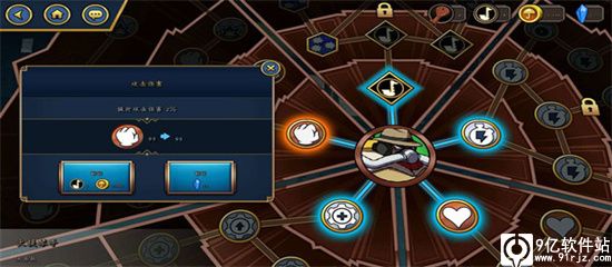 在这里你可以升级角色或者提升天赋。在升级天赋的时候建议大家优先选择提升伤害或者增强暴击的天赋。在角色的下方是技能点击可以查看技能伤害等级或者升级出售。