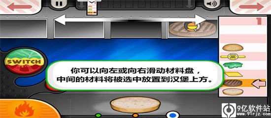 11、你可以向左或向右滑动材料盘,中间的材料将被选中放置到汉堡上方。