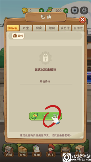 5、想要清扫店铺的话,还是要点击左下角的【店铺】,然后在弹出来的页面花300块钱清扫费;然后就是餐饮的心脏了——厨房,点击左下角的【店铺】,然后在弹出来的页面花200块钱清扫费;