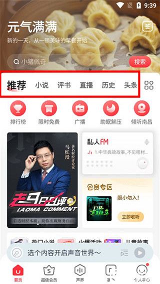 3、在首页提供了小说、评书、直播、历史、头条等分类;