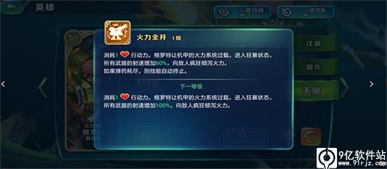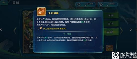这里提额外一点,所有带有金色边框的技能全为主动技能,无边框都是被动技能,也是一个新手区分主动被动技能的小技巧。火力风暴是技能释放方式中比较特殊的,玩lol的玩家,用过三只手的应该对这个技能得心应手,因为释放方式几乎一直,点击第一次确定技能释放起始位置,第二次圈定技能释放方向,两点一线就和技能说明一样是一条直线。是非常不错的技能,用好了可以直接攻击到对方的关键英雄的后排。