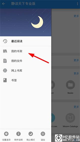 2、在静读天下的个人功能列表里,就可以点击进入“我的书架”页面,从而搜索手机本地的书籍。