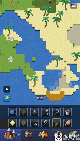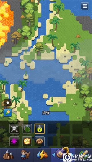 1、这款手游的美术是2D像素风格,看起来非常简单,上手没有什么铺垫,也没太多的引导,直接面对随机生成的一个世界,这个世界有海洋,有陆地,偶尔还会有一些正在喷发的火山,似模像样,玩家可以用手机放大屏幕,展现地形地貌的细节,设计很不错。