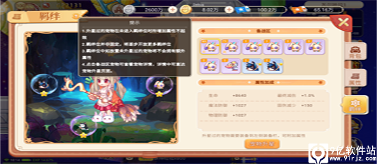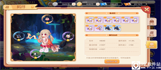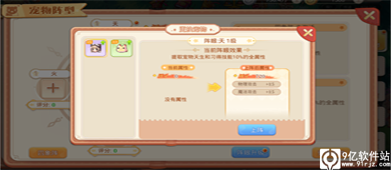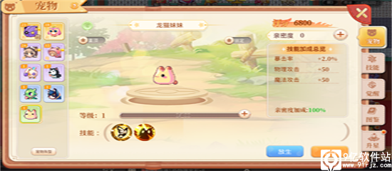 宠物页面可以查看自己的宠物等级、技能、亲密度、技能加成、阵型。
