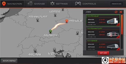 3、控制卡车前进道指定绿色区域领取任务,每个任务地点和货物不同,点击选择合适自己的任务,然后按“GET JOB”按钮。