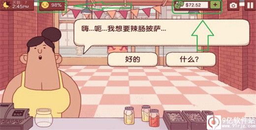 1、首先我们桌上角的太阳代表时间,当到达9:00后我们就下班了,旁边数值代表客人的耐心度,当跌到50%的时候客人就不会给小费了,右边是我们的金额。