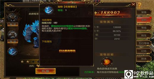 1、宠物系统介绍:宠物是单职业的特色玩法,宠物可以刀刀麻痹BOSS,可以让你轻松打BOSS,升级宠物可以提高对怪伤害,提升角色的刀刀斩杀伤害,加快角色和宠物对BOSS的输出伤害。